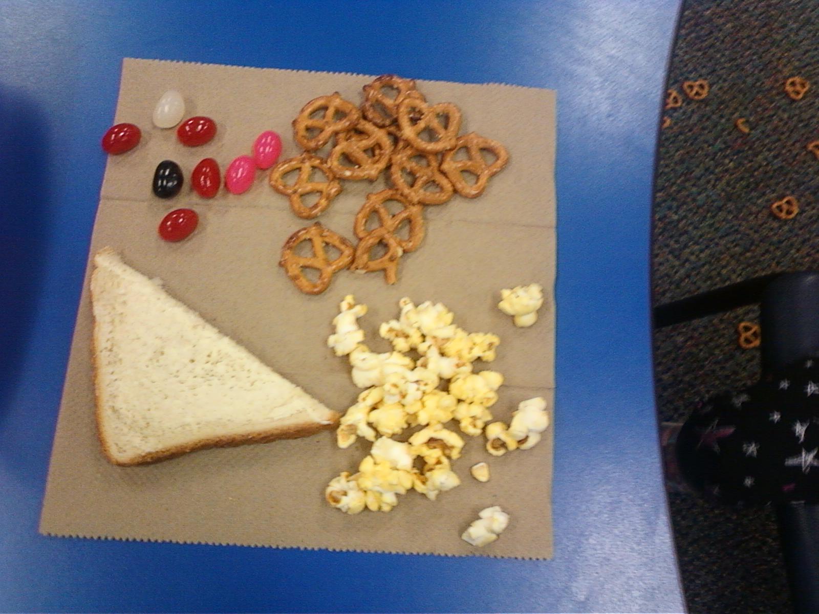 Today, we celebrated Thanksgiving, "Charlie Brown" style. We watched a Charlie Brown Thanksgiving and then replicated the "feast" that Charlie Brown made for his friends in the show. It was a very odd snack but lots of fun! Sorry about the picture quality. I forgot my camera and had to use my phone- which doesn't take great pictures.